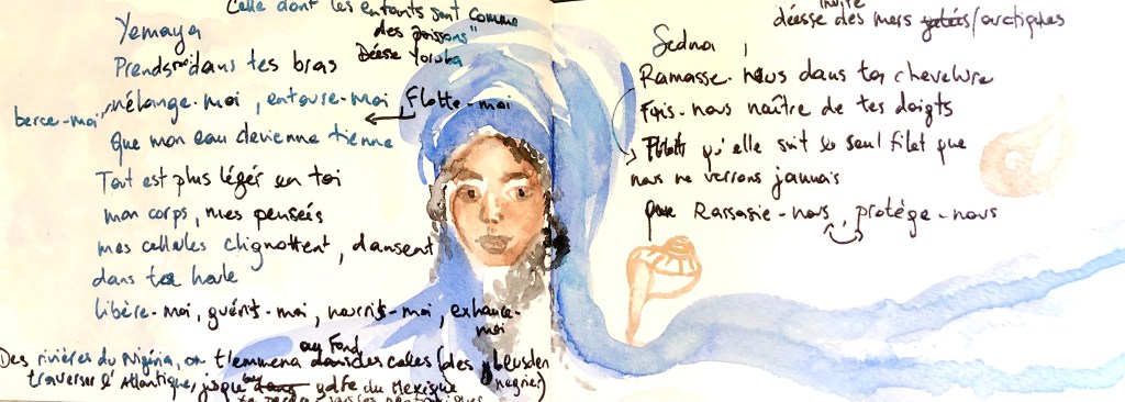 « J’ai besoin de marcher, loin, sans obstacle: une ligne blanche ininterrompue, enfin sortie de ce plan étriqué. Et puis faire taire ce brouhaha. De l’ouate mate du tapis de neige, cultiver avec précaution les mélodies naissantes. Là-bas, on doit se sentir plus près du ciel, enveloppée par les merveilles plus puissantes que la magie : la lune, les marées gelées, les rochers, nos rêves. Sauvage, sans entraves, entier. Sikumut* ; mon âme est aspirée hors des rassemblements humains. Sikumut* ; mon cœur s’enfonce dans des pistes non-tracées. »